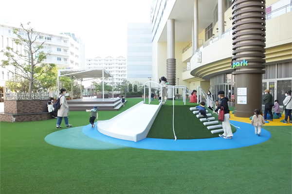 座ったり、寝そべったりできる人工芝を敷き詰めたくつろぎスペース。 お子さまが安全に遊べる遊具もあり、世代を問わず憩える場となっています。