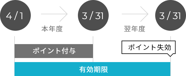 - 毎年4月1日から翌年3月31日までを年度とし、年度内に付与されたポイントは、翌年度の3月31日をもって失効となります。