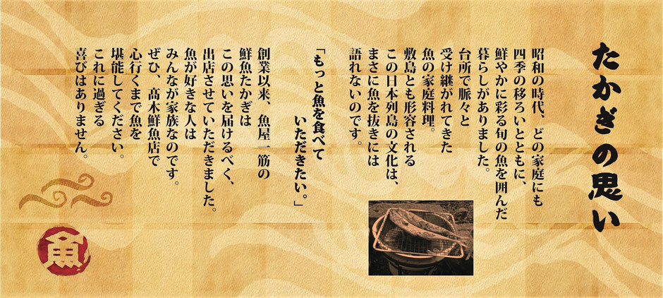 昭和の時代の魚屋は活気溢れる掛け声と笑顔であふれていました。そんな時代の魚屋を再現し、お客さまと店員、お客さまとお客さまの心触れ合う場となるお店作りに励んでおります。鮮魚たかぎが提供するもの「活き、元気、笑顔」です。