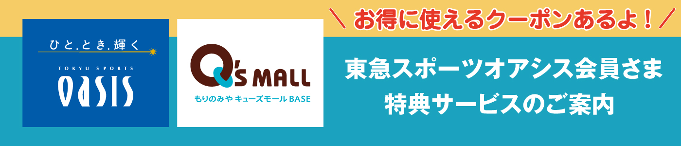 もりのみやキューズモールBASE限定 東急スポーツオアシス会員さま 特典サービスのご案内 ※内容は変更・中止になる可能性がございます。詳細は各店舗までお問い合わせくださいませ。 この機会にぜひご利用くださいませ!